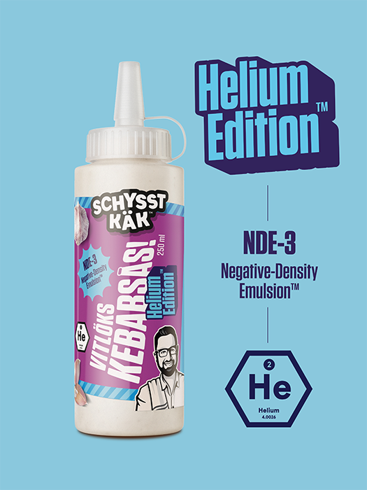 Kebabsåsen du inte visste att du längtat efter är äntligen här! Samma schyssta smak som originalet och perfekt för dig som vill ha extra sås i rullen utan mer tyngd! Med vår patenterade process Negative-Density Emulsion™ (NDE-3) frigörs de hydrofoba ändarna och såsen blir lättare än luft. Håll i såsflaskan (så den inte svävar iväg) och ge helgen extra allt!